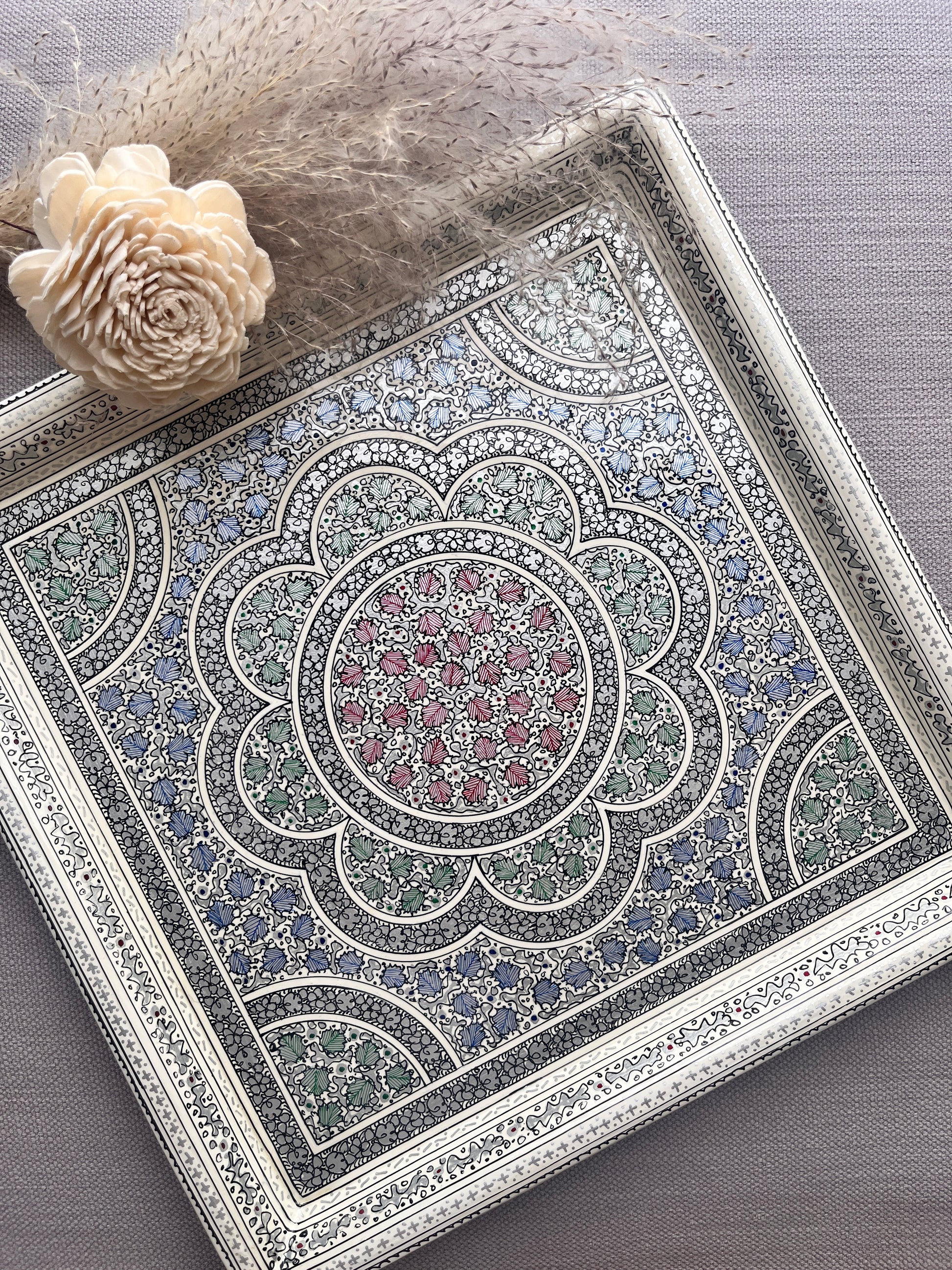 Our trays from Kashmir are a natural beauty, handcrafted with detailed precision and intricate designs. With each tray being individually painted and unique, you will own a small piece of art. Made from wood and later lacquered, these trays are not only aesthetically pleasing, their functionality will be a welcomed addition to your hosting. Let the elegance and beauty of these trays elevate your entertaining and dining experience.