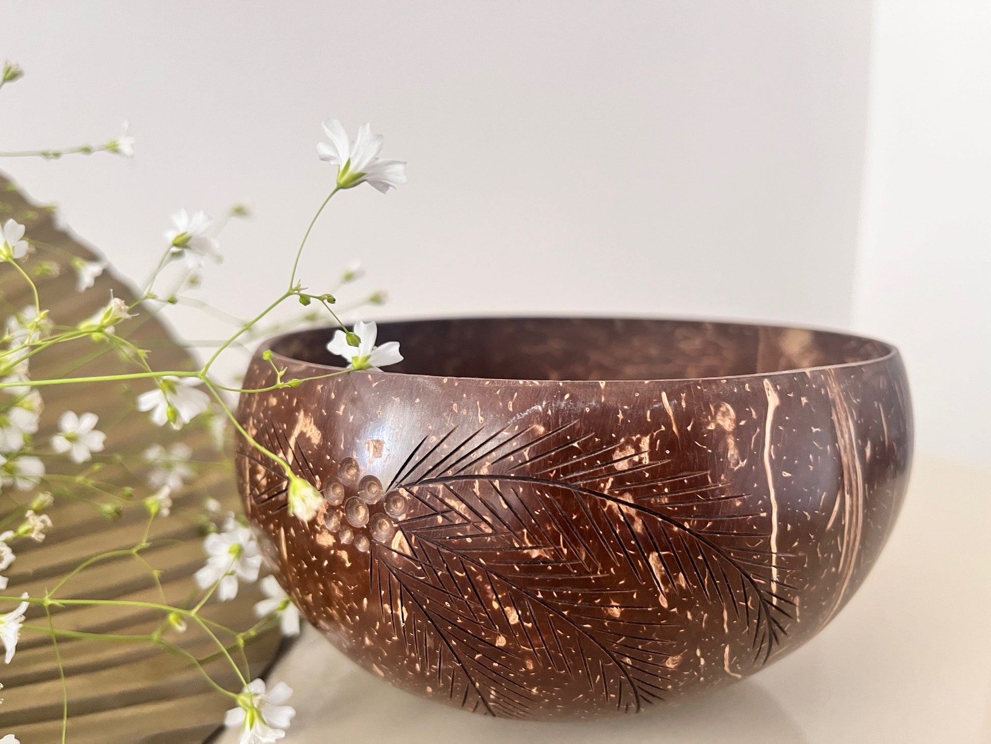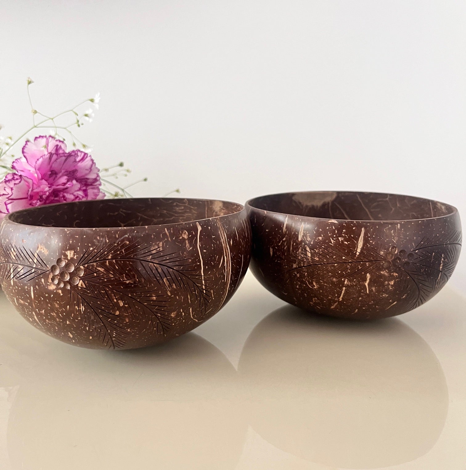 Handmade from natural coconut shells, these beautifully designed bowls feature an intricate carved leafy pattern. They are available in a set of two. Lightweight and eco-friendly, they retain their natural color and charm. Perfect for serving cold snacks or as decorative accents, they bring a touch of nature and craftsmanship to your home!